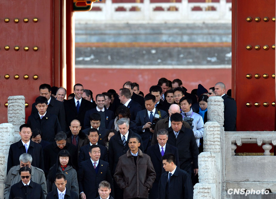 11月17日,正在中國(guó)進(jìn)行國(guó)事訪問的美國(guó)總統(tǒng)奧巴馬一行參觀北京故宮。圖片來源:中國(guó)新聞網(wǎng)
