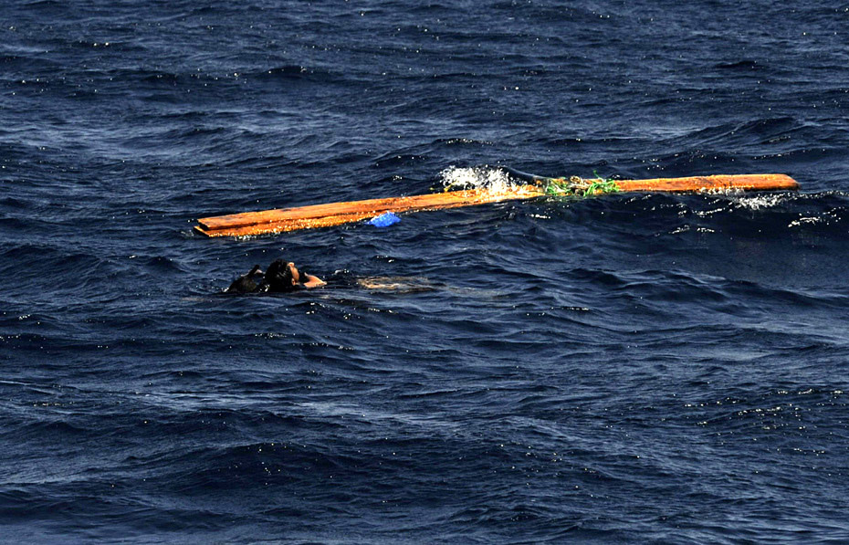 11月17日,亞丁灣,3名漁民抱著木板在海面上漂流3天后獲救。據悉,他們遭遇了十幾名名疑似海盜的劫持,海盜們讓其選擇或跳海逃生或被殺死。圖片來源:中國新聞網