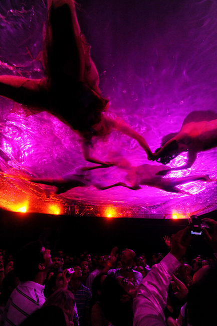 近日,阿根廷演員在加拉加斯舉行了一場名為“蠻力”水下演出,光怪陸離的燈光配合水中的演出吸引了大量觀眾到場觀看。圖片來源:中國新聞網