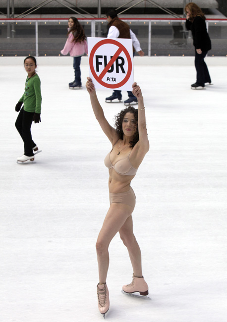 11月24日,美國花樣滑冰的傳奇人物、1979年世界花滑錦標賽冠軍得主芭比洛尼在紐約洛克菲勒廣場復出“裸滑”。這次表演是為了支持善待動物協(xié)會的反對皮草行動。