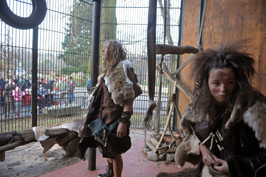 11月27日,波蘭首都華沙動(dòng)物園里,一男一女兩個(gè)志愿者扮成原始洞穴人向參觀者進(jìn)行展示。該動(dòng)物園想通過(guò)這項(xiàng)為期一周的活動(dòng),提醒參觀者注意人類也是動(dòng)物界的一部分。
