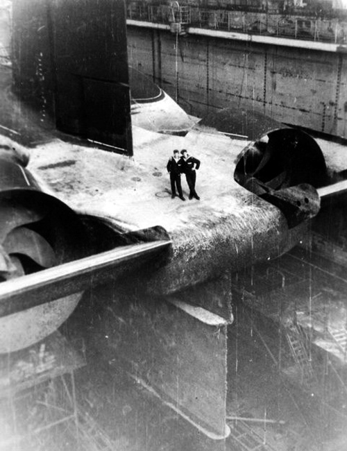 圖為兩名水兵站在“臺風(fēng)”碩大無比的尾部。圖片來源:人民網(wǎng)