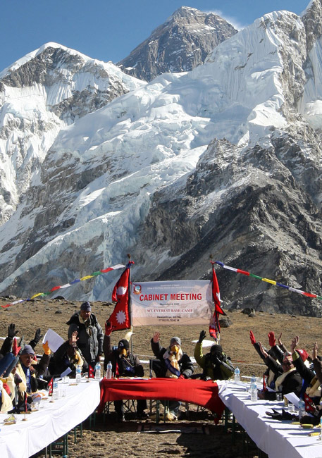 12月4日,尼泊爾總理和22位部長在喜馬拉雅山海拔5262米的高度舉行內閣會議,討論全球變暖對喜馬拉雅山的影響。
