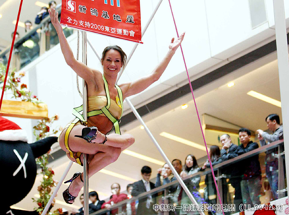 十二月三日,兩項吉尼斯世界紀錄鋼管舞蹈家Nele Sehrt在香港APM商場三十呎高空獻藝,示范一分鐘抱鋼管倒立動作。中新社發 洪少葵 攝 圖片來源:中國新聞網>>點擊觀看詳細內容