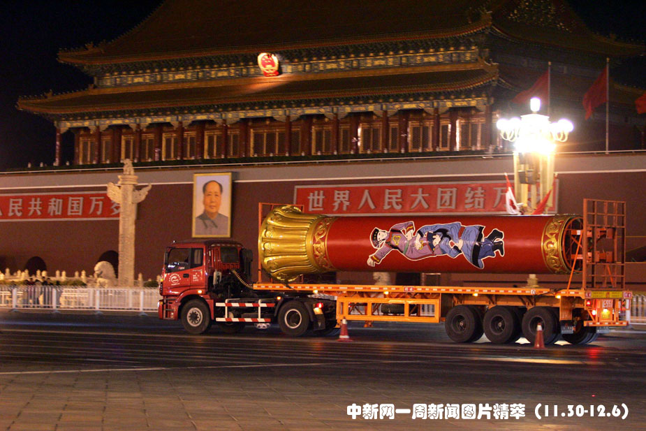 12月3日凌晨,北京天安門廣場上象征民族大團結的56根民族團結柱,經北京住總集團等單位的施工,已從天安門廣場全部拆除,進行回廠維護。國慶六十周年慶典期間,分列在天安門廣場兩側的民族團結柱受到全國各族人民的喜愛,成為節日一道亮麗的風景。為了永久留存這56根民族團結柱,北京市政府決定將它們拆除遷移回廠,進行妥善維護后再擇地安放。圖片來源:中國新聞網