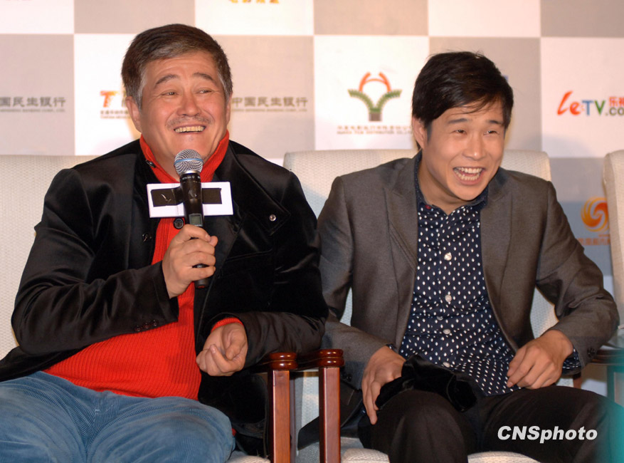 12月9日下午,張藝謀喜劇新作《三槍拍案驚奇》在京舉行首映發布會,導演張藝謀、大病初愈的趙本山攜孫紅雷、小沈陽、閆妮、倪大洪、程野、毛毛全明星主創團隊齊齊亮相。現場張藝謀、趙本山、小沈陽搞笑不斷,引得爆笑連連,上演了一出戲外喜劇。趙本山首度回應了花兩億購買私人飛機一事,稱還沒有定下來。張藝謀表示會和“趙家班”繼續深度合作,并且豪言預計未來的中國電影單部影片票房可能達到2億美元。圖為張藝謀、趙本山、小沈陽成為“笑彈”。中新社發 李學仕 攝