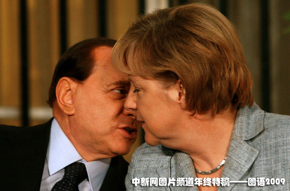 貝魯斯科尼與默克爾親密交談:2009年1月18日,以色列總理奧爾默特舉行記者發布會宣布;饡r,意大利總理貝盧斯科尼(左)和德國總理默克爾親密交談。