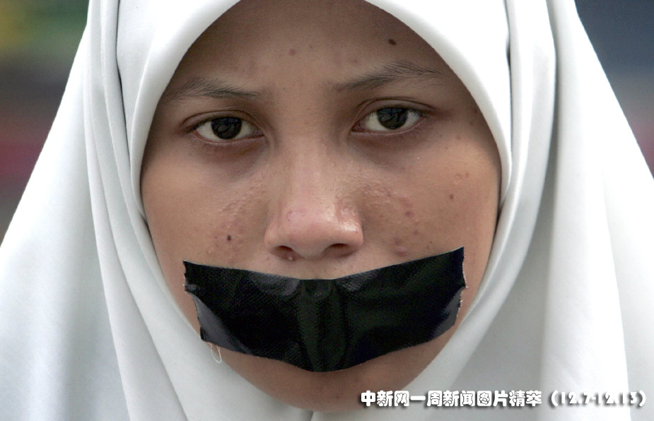 9日(周三),印尼首都雅加達,一位婦女嘴上貼著黑色膠布,參加反腐示威游行。圖片來源:中國新聞網