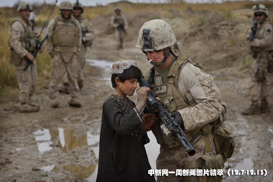 10日(周四),阿富汗,一名美軍士兵正在向一位當(dāng)?shù)啬泻⒄故舅奈淦鳌D片來源:中國新聞網(wǎng)
