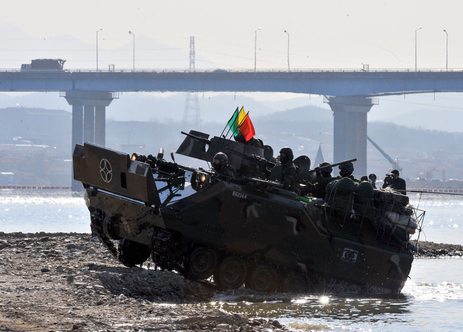12月16日,韓國第20師團機械化部隊在京畿道驪州南漢江一帶進行大規模渡河實戰訓練。該訓練以培養戰斗執行能力為重點。圖片來源:中國新聞網
