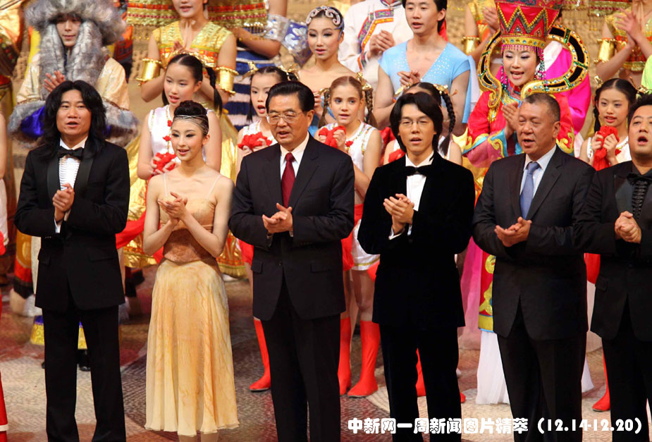 19日(周六)晚間,澳門特區舉行盛大文藝晚會,慶祝澳門回歸祖國十周年。國家主席胡錦濤與演員一起唱響《歌唱祖國》。圖片來源:中國新聞網