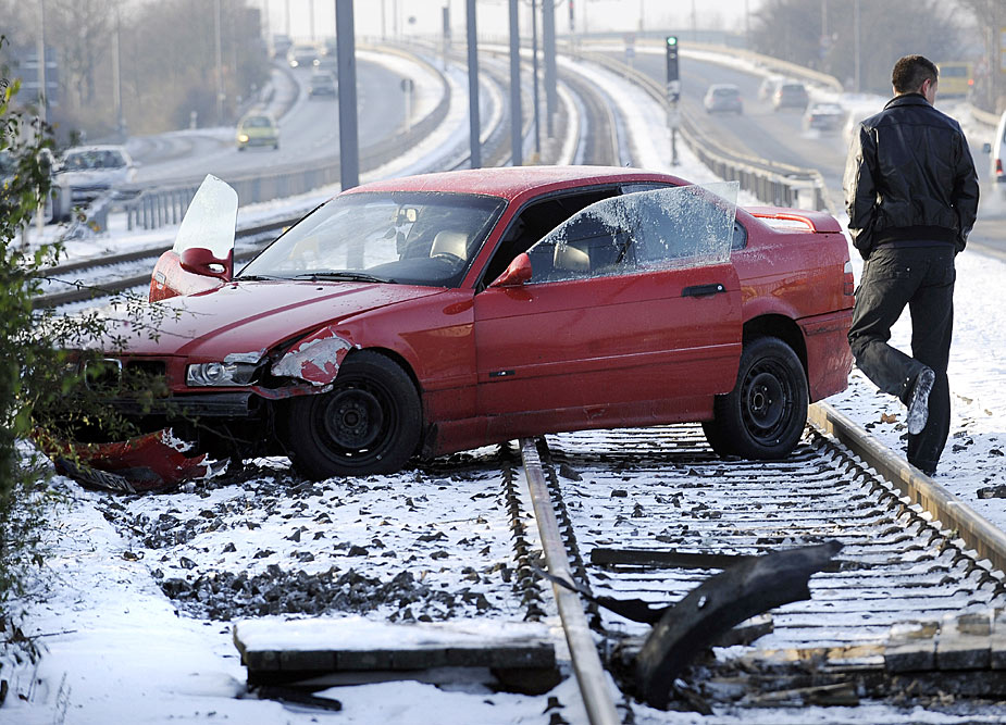 圖為12月19日,嚴寒和大雪使德國的一些車輛失控造成交通事故。