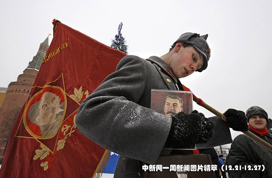 21日(周一),一名俄羅斯士兵手持斯大林肖像,等著向莫斯科紅場上的斯大林墓敬獻鮮花,以紀念這位前蘇聯領導人130周年誕辰。