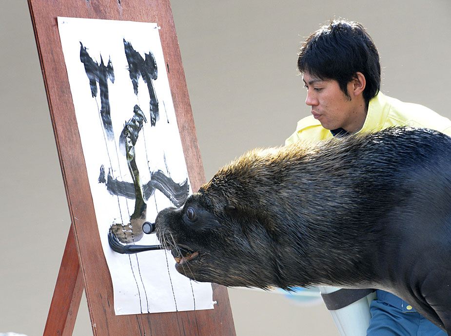 12月30日,日本神奈川八景島海洋樂園水族館內(nèi),海獅表演了用毛筆在紙上“寫”漢字的節(jié)目。圖片來源:中國新聞網(wǎng)