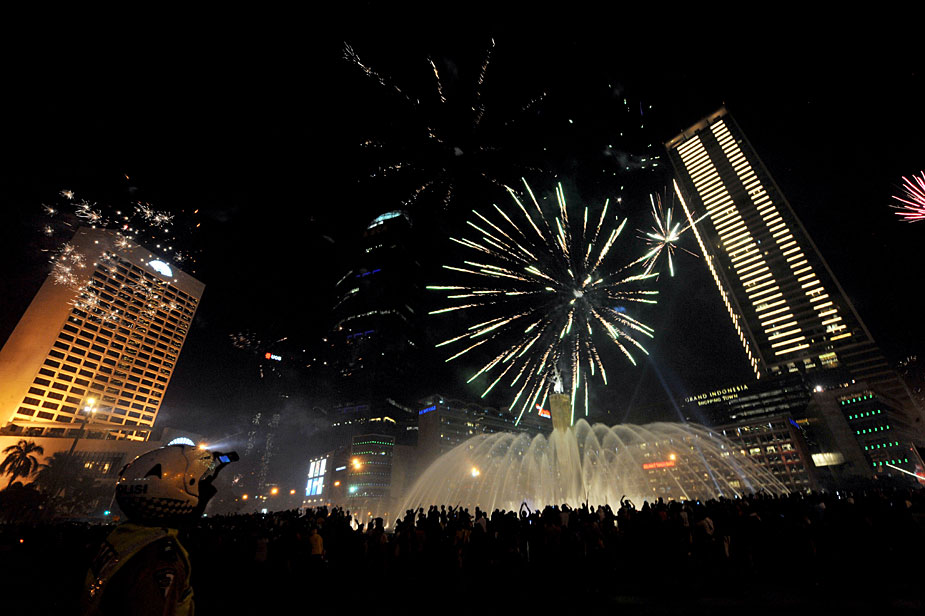 圖為2010年1月1日,印尼首都雅加達(dá)人們?nèi)挤牌痨披惖臒熁ā?/p>