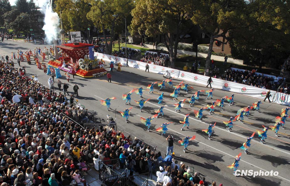 美國當地時間1月1日,第121屆美國玫瑰花車大游行在加州帕薩迪納市隆重舉行。著名影星成龍助陣中國上海世博花車。圖片來源:中國新聞網