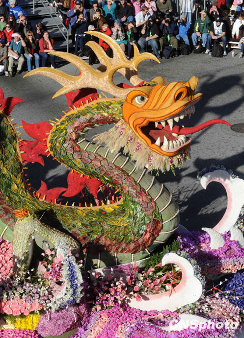 美國當(dāng)?shù)貢r(shí)間1月1日,第121屆美國玫瑰花車大游行在加州帕薩迪納市隆重舉行。著名影星成龍助陣中國上海世博花車。圖片來源:中國新聞網(wǎng)