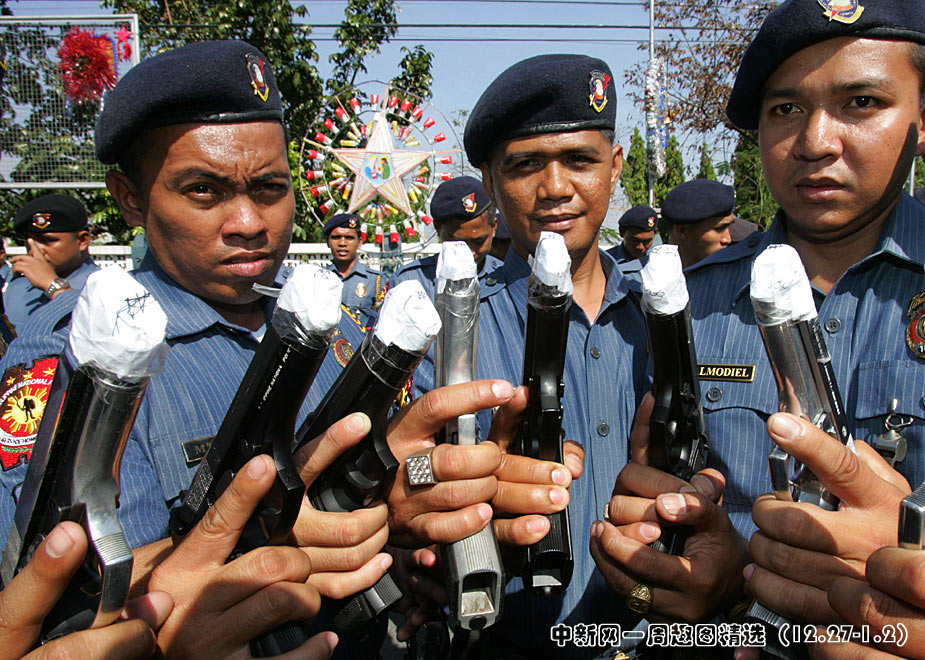 12月29日,菲律賓首都南部的塔吉格市警察部隊為了防止警務人員在慶祝新年時胡亂開槍,下令用膠紙把槍口封起來。圖片來源:中國新聞網>>點擊觀看詳細內容