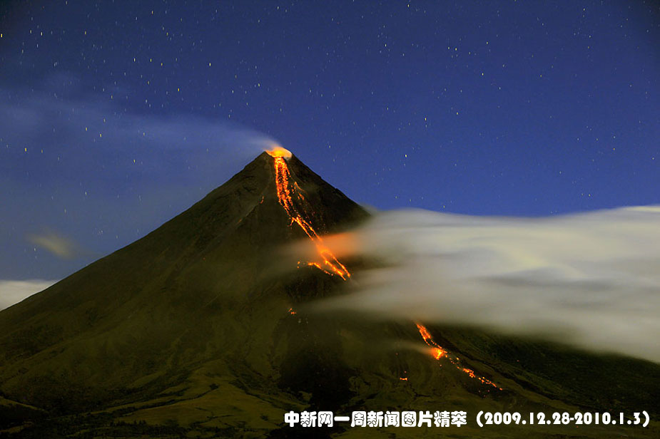 周二(29日)在菲律賓黎牙實比,巖漿從馬榮火山山口流出。由于該火山開始爆發,大約有5萬人被撤離到臨時房屋中。圖片來源:中國新聞網