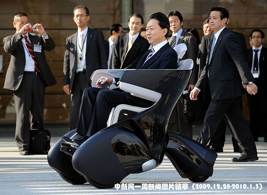 周三(30日),日本首相鳩山由紀夫抵達日本某公司試駕該公司生產的“i-Real”單人用交通工具。“i-Real”由輕質的碳纖維和塑膠制成,控制方式由傳統汽車的方向盤操作改為兩側手臂休息處的控制面板,最高時速可達18.6英里/時。圖片來源:中國新聞網