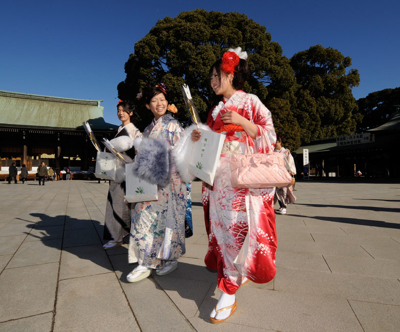 今年的1月11日,是日本傳統的成人節,所有滿20歲的年輕人將宣告自己邁進了成人行列。1月8日,日本一家公司年滿20歲的年輕女孩紛紛穿上和服,到廟宇中祈福,提前慶祝成人節的到來。