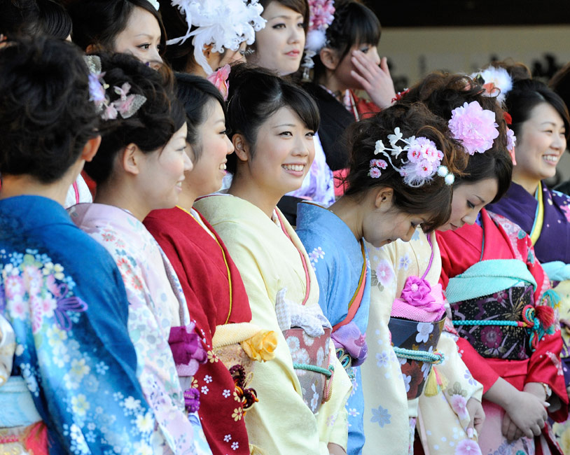今年的1月11日,是日本傳統的成人節,所有滿20歲的年輕人將宣告自己邁進了成人行列。1月8日,日本一家公司年滿20歲的年輕女孩紛紛穿上和服,到廟宇中祈福,提前慶祝成人節的到來。