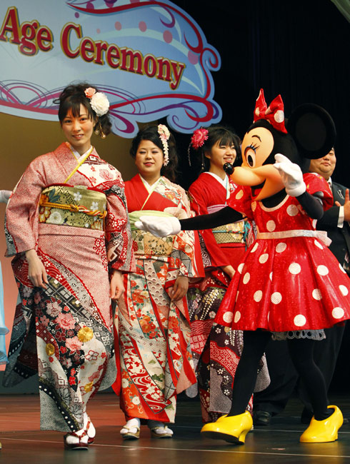 1月11日,日本迎來2010年的成人節日,所有年滿20歲的年輕人都將在這一天宣告自己邁進了成人行列。眾多年輕的日本女孩身穿和服在東京迪斯尼樂園里快樂游玩,迎接自己的節日。