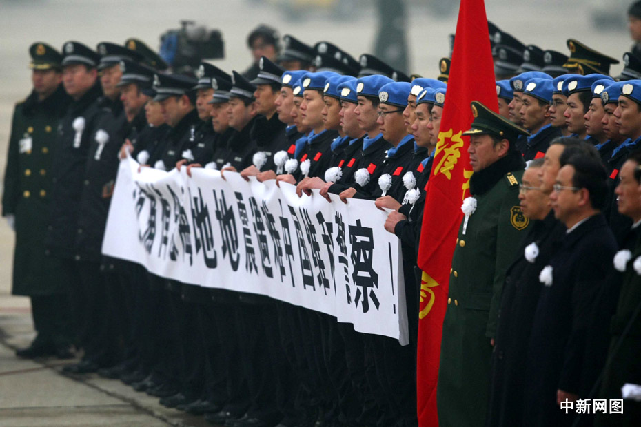 1月19日上午,在海地地震中犧牲的八位中國維和警察遺體回國接機(jī)儀式在北京首都機(jī)場舉行。中新社記者 富田 攝