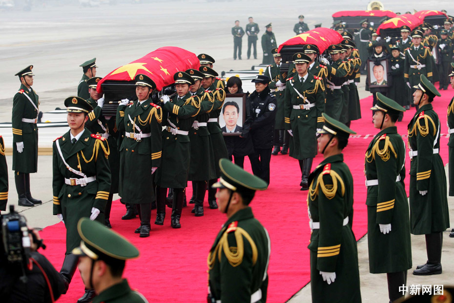 1月19日上午,在海地地震中犧牲的八位中國維和警察遺體回國接機儀式在北京首都機場舉行。中新社記者 富田 攝