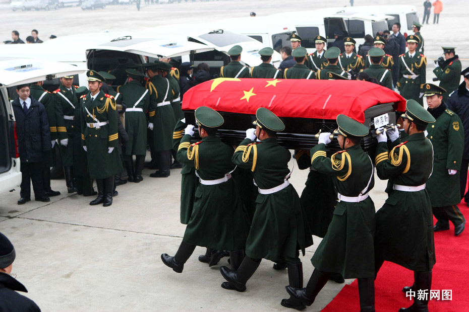 1月19日上午,在海地地震中犧牲的八位中國維和警察遺體回國接機儀式在北京首都機場舉行。中新社記者 富田 攝
