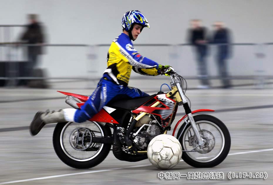 1月22日,國(guó)際摩托車(chē)貿(mào)易博覽會(huì)上,一場(chǎng)名為“魅力摩托”的足球比賽吸引了眾人的目光,參賽者駕駛摩托的同時(shí)還不忘將足球送入對(duì)方的大門(mén)。 圖片來(lái)源:中國(guó)新聞網(wǎng)>>點(diǎn)擊觀看詳細(xì)內(nèi)容