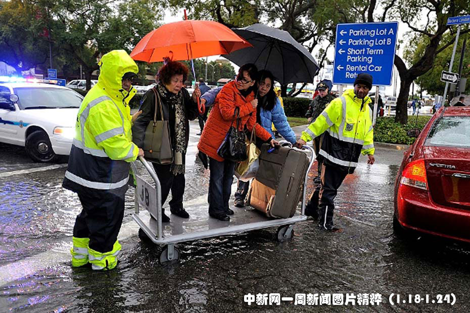 1月20日,在近期遭受暴風(fēng)雨襲擊的加州長灘地區(qū),捷藍航空公司工作人員幫助乘客穿過被水淹沒的機場停車場。圖片來源:中國新聞網(wǎng)