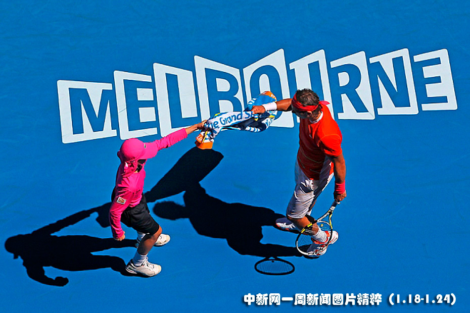 1月20日,在于墨爾本舉行的澳大利亞網(wǎng)球公開賽上,西班牙球手納達(dá)爾在對(duì)陣斯洛伐克球手拉科的比賽中從球童手中接過毛巾。納達(dá)爾最終擊敗拉科晉級(jí)。圖片來源:中國(guó)新聞網(wǎng)