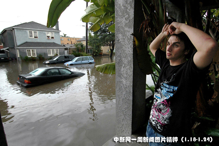 1月19日,羅杰斯在雨水涌進家中之后在鄰居的門廊下躲避。因另一場太平洋暴風雨在向美國南加州地區逼近,迫使數百名居民撤離。圖片來源:中國新聞網
