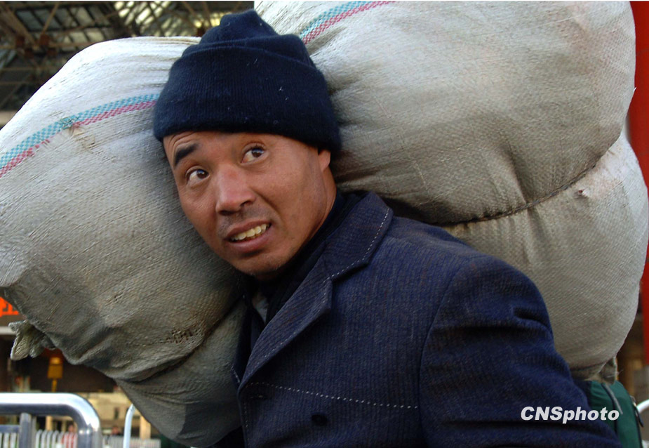 一年一度的春運今日起正式開始。2010年的春運從1月30日起至3月10日,為期40天,其中節前15天,節后25天。據權威預測,今年春運客運量料超25億人次。 1月30日,北京西站廣場上,一名中國民工扛著行囊和打工的收獲,返鄉過節。中新社發 鄒憲 攝