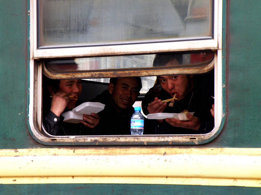一年一度的春運今日起正式開始。2010年的春運從1月30日起至3月10日,為期40天,其中節前15天,節后25天。據權威預測,今年春運客運量料超25億人次。圖為1月30日,春運啟幕,湖北宜昌火車站,旅客在火車上吃午餐。劉君鳳 攝