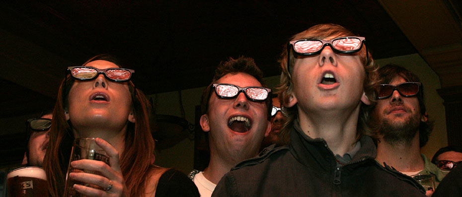 圖為球迷在倫敦的酒吧里享受3D足球直播。北京時間2月1日,英國體育頻道首次使用3D技術對阿森納與曼聯的比賽進行電視直播。據悉,今年南非世界杯也將進行3D轉播。
