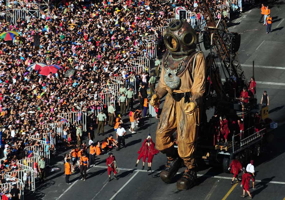 近日,智利首都圣地亞哥街頭,法國一劇團攜巨型提線木偶“小巨人”上街表演,它惟妙惟肖的表情和逼真的神態引得周圍觀眾的陣陣掌聲。圖片來源:中國新聞網