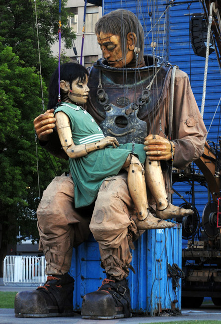 近日,智利首都圣地亞哥街頭,法國一劇團攜巨型提線木偶“小巨人”上街表演,它惟妙惟肖的表情和逼真的神態(tài)引得周圍觀眾的陣陣掌聲。圖片來源:中國新聞網(wǎng)