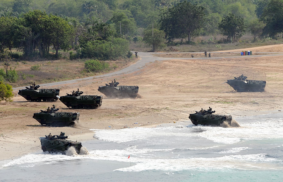 2月4日,參加“金色眼鏡蛇”聯合軍演的各國軍隊,在泰國的Rayong省沙灘進行了兩棲登陸演練。本次聯合軍演共有來自泰國、美國、印度尼西亞、新加坡、日本、韓國的約1.4萬名軍人參加。圖片來源:中國新聞網