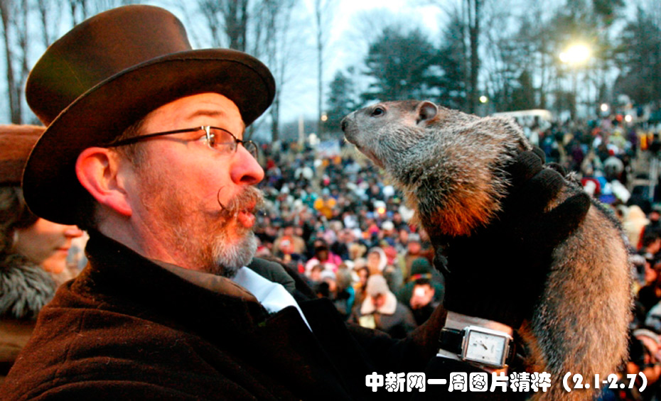 2月2日(周二),在美國賓夕法尼亞州的土撥鼠鎮(Punxsutawney),本休斯(Ben-Hughes)抱著從地洞里爬出的土撥鼠菲爾,據說菲爾“看見”了自己的影子。根據傳統,如果菲爾能看見自己的影子那就意味著冬季還要再延續六周。圖片來源:中國新聞網
