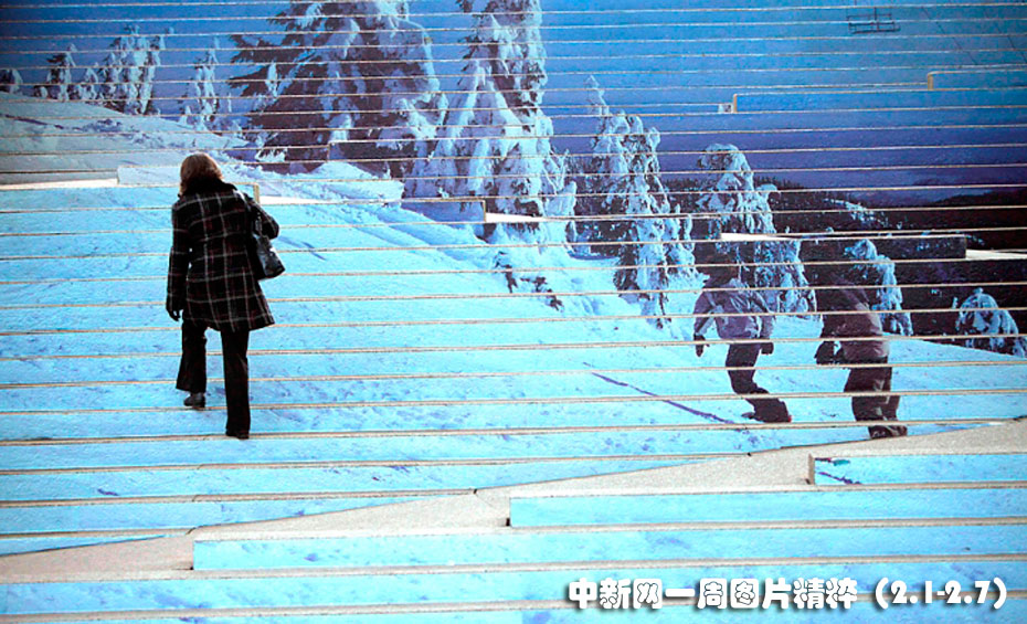 2月2日(周二),在溫哥華不列顛哥倫比亞市,一位女士在覆蓋了滑雪圖的樓梯上行進。溫哥華冬奧會于2010年2月12日開幕。圖片來源:中國新聞網