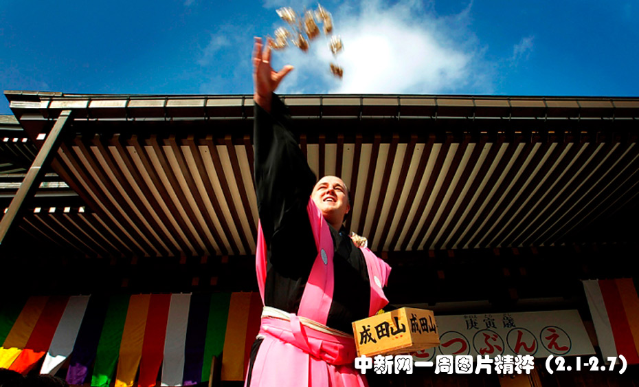 2月3日(周三),在日本千葉成田的一座寺廟,相撲新手、來自愛沙尼亞的巴魯托(Baruto)向人群拋撒袋裝的大豆。這種儀式通常在農(nóng)歷新年進(jìn)行,據(jù)說可以帶來好運(yùn)。圖片來源:中國新聞網(wǎng)