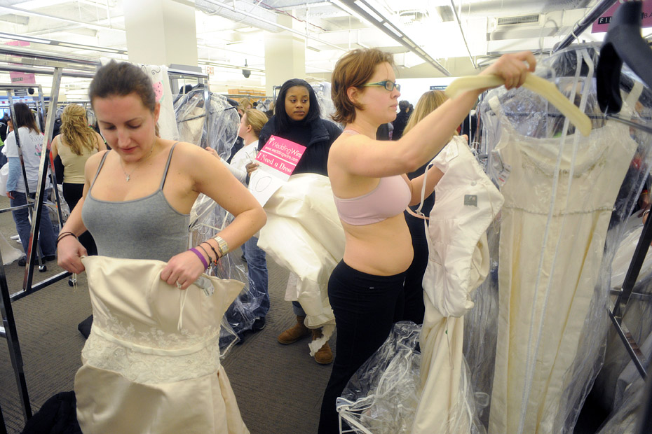 近日,美國紐約一年一度的“新娘快跑”婚紗促銷活動舉行。千余名來自全美各地的準新娘和親朋好友,早早就在門口等候,平時上千美元婚紗只需要五分之一的價格就能帶回家。圖片來源:中國新聞網