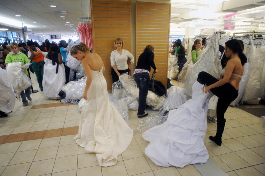 近日,美國(guó)紐約一年一度的“新娘快跑”婚紗促銷活動(dòng)舉行。千余名來(lái)自全美各地的準(zhǔn)新娘和親朋好友,早早就在門口等候,平時(shí)上千美元婚紗只需要五分之一的價(jià)格就能帶回家。圖片來(lái)源:中國(guó)新聞網(wǎng)