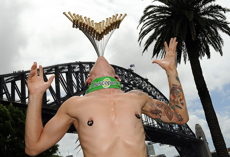 2月8日,街頭藝人Chayne Hultgren在澳大利亞悉尼海港大橋前,一次吞下18把厚約1.3厘米,長約50.8厘米的長劍,刷新了吉尼斯世界紀錄。圖片來源:中國新聞網