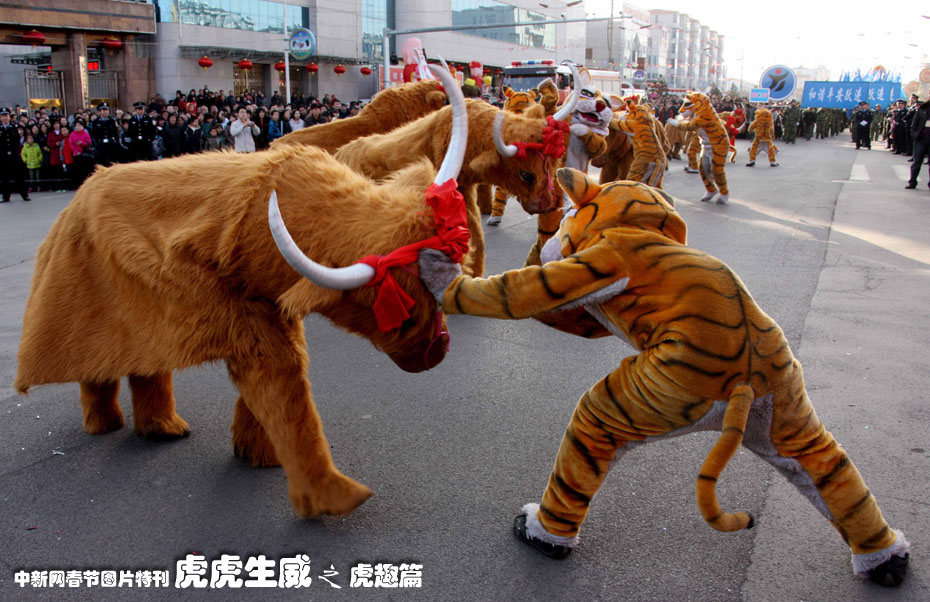 2月10日是正月十六,山西省盂縣舉辦《金牛鬧春》大型街頭春節文化活動節目展演,為現場5萬余名觀眾奉上了一場豐盛的元宵節文化大餐。盂縣西小坪村的旱船和東城武村的腦閣及石店煤礦的牛逗虎是展演活動中的三項非物質文化遺產保護項目,是最有特色的民間紅火形式之一,它不僅歷史悠久,而且因為道具造型獨特,表演套路豐富,音樂伴奏喜慶熱烈而受歡迎。中新社發 程瑜 攝