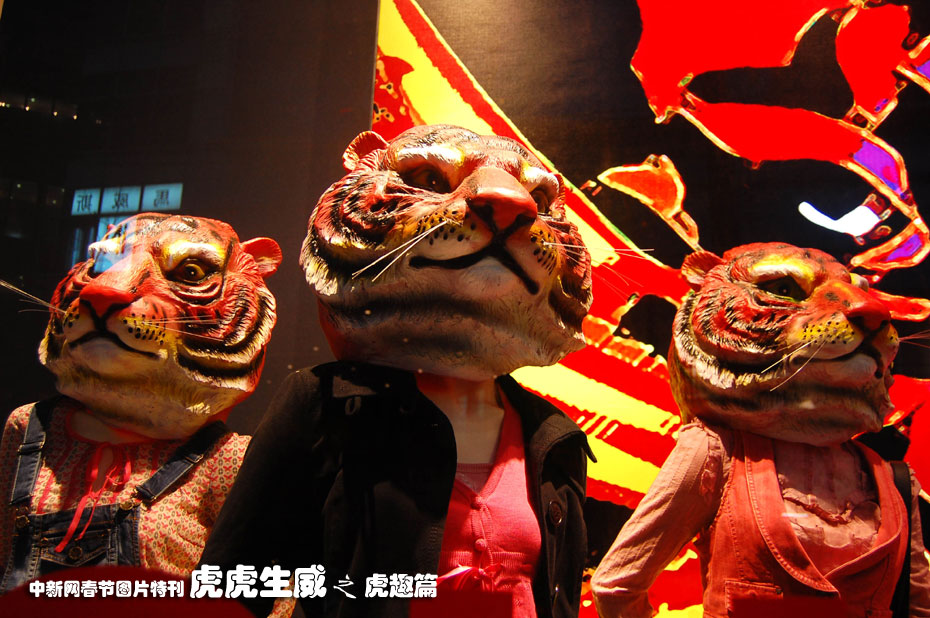 1月31日,上海市西藏中路的一家商店櫥窗中,服裝模特的頭變成了老虎頭,商家以“虎哥虎姐”吸引顧客前往購物。隨著春節(jié)的臨近,各大商家紛紛推出各類“虎年促銷”,吸引顧客消費(fèi)。中新社發(fā) 許康平 攝
