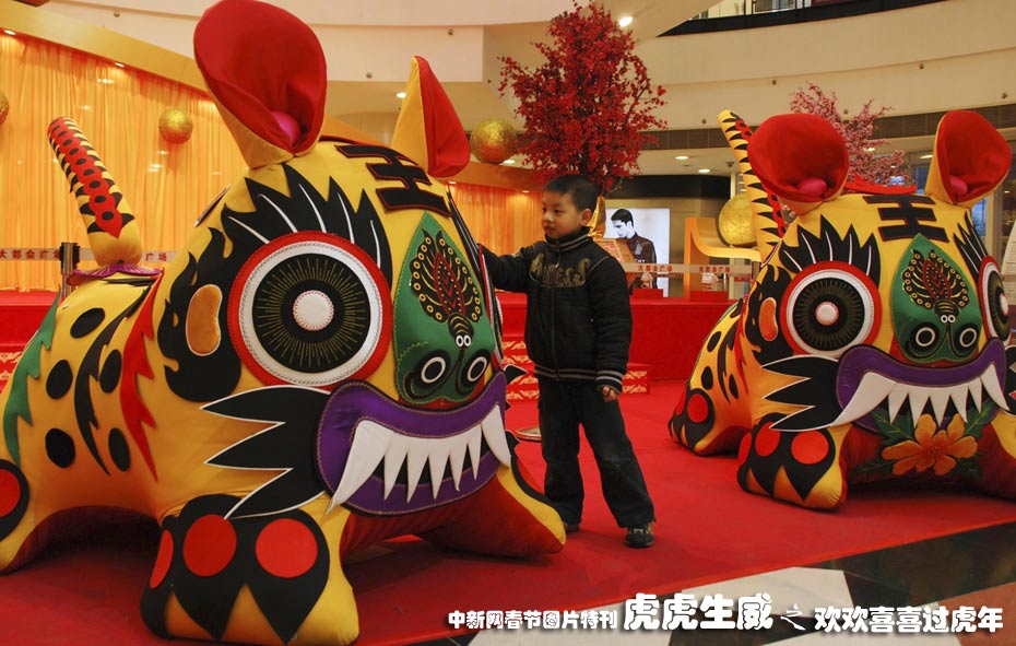 1月下旬,曾榮獲中國民間藝術高層論壇金獎等多項榮譽的純手工布藝老虎,來到重慶賀新春。在重慶某商場展示的這對布老虎是由奧運福娃設計者韓美林的得意弟子劉清華親自設計并制作。圖為身長2.2米、寬1.2米、高1.7米的布老虎吸引小朋友駐足拍照留念。中新社發 郭晉嘉 攝