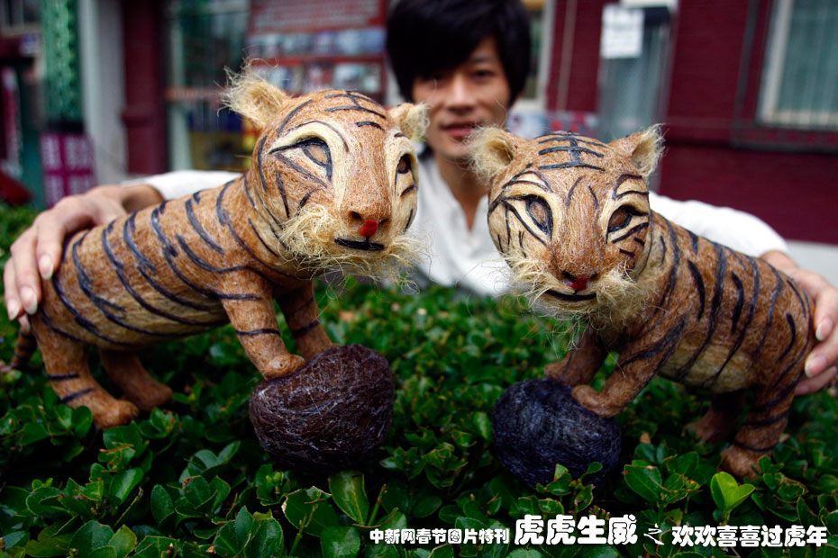 2009年11月9日,北京一位時尚發型設計師正在展示頭發絲作品“福虎神威”賀歲虎年。這是祖國60華誕之后的又一新作,四川青年理發師黃鑫用2.6公斤碎頭發制作了一對可愛逼真的“;ⅰ,歷時兩個多月的時間才完工。中新社發 鄭雄增 攝